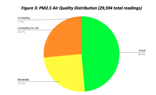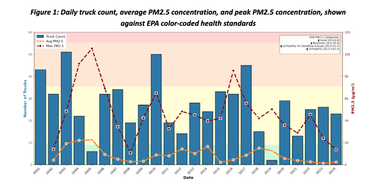 50% of the air quality readings were Moderate or Unhealthy for Sensitive Groups, which is concerning for neighborhoods with children and elderly residents. During the study, we also observed a close correlation between the number of trucks and air quality on the monitored days.